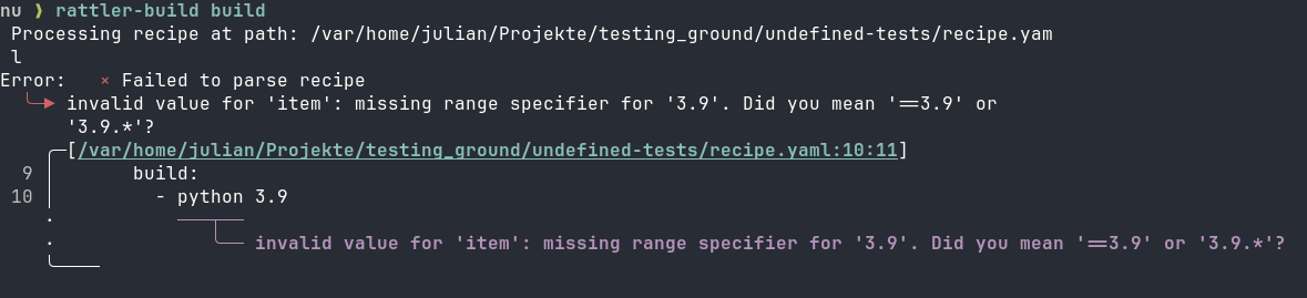 Let's start with the annoying stuff. One thing we realized early was that we can still improve on our error messages. There were cases that were ambiguous and/or wrong, and Rattler-Build just guessed and ignored it.
