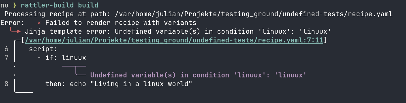 linux is a valid variable, but linuux isn't. With versions earlier than 0.58, Rattler-Build would have simply skipped the if-branch. Now, we get a clear error message like this one: