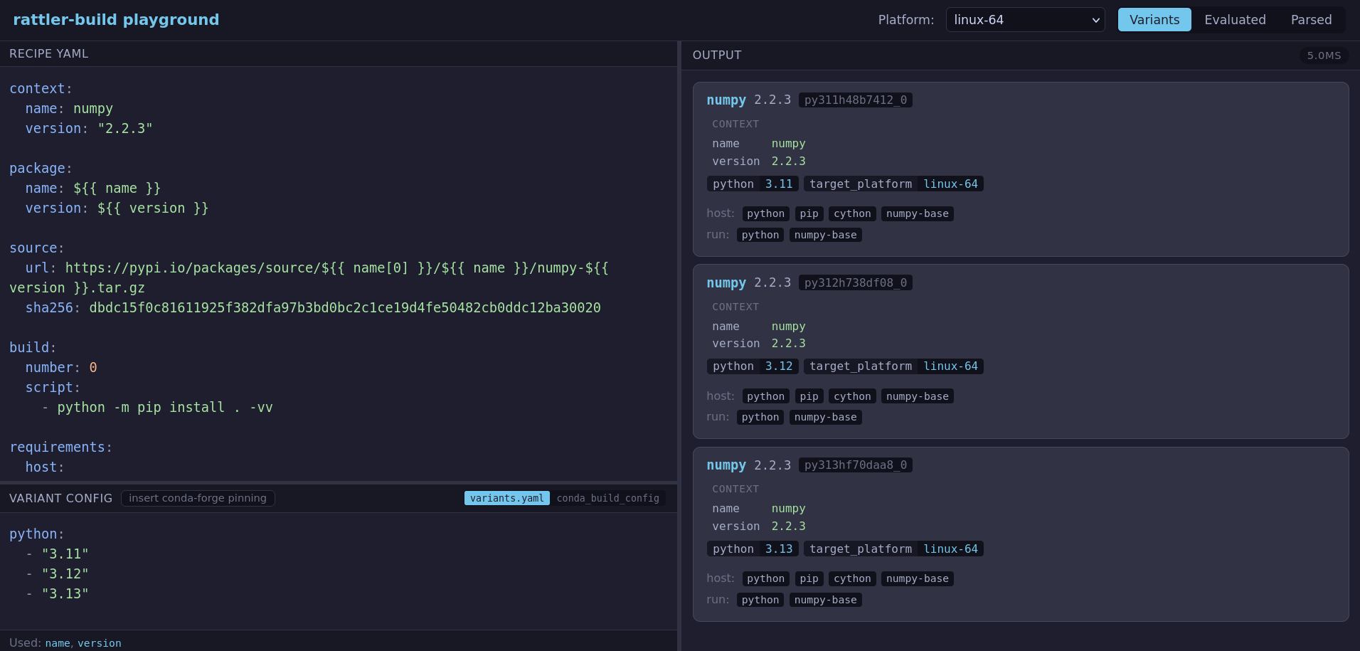 This allows for use cases that would have been difficult to do with the Rattler-Build CLI. In this example, we use some of these crates to render a recipe and check how a variant file influences the host dependencies declared in a recipe.